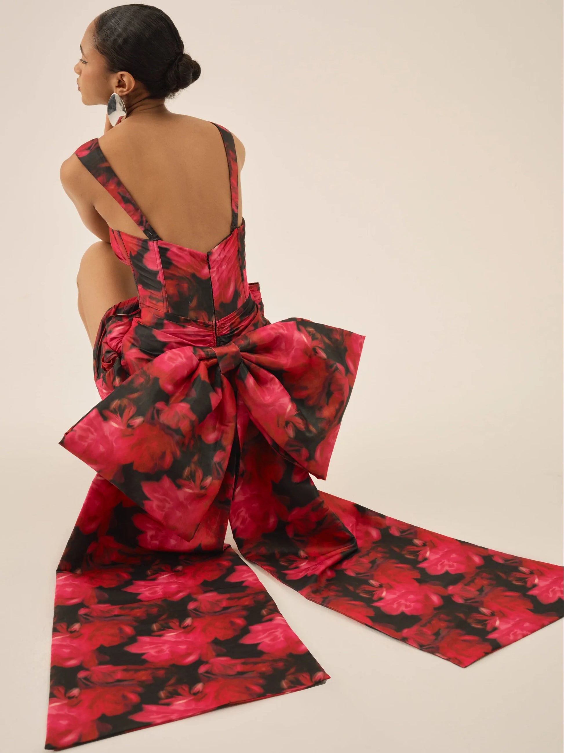 Make an unforgettable entrance in the Dark Romance red mini dress—a taffeta dress printed with moody abstract roses. Cut to a high neckline, this party dress features a fitted boned bodice, a fitted wrap style skirt, and a decorative exaggerated sweeping bow at the center-back which gives the illusion of a hi-low hem.