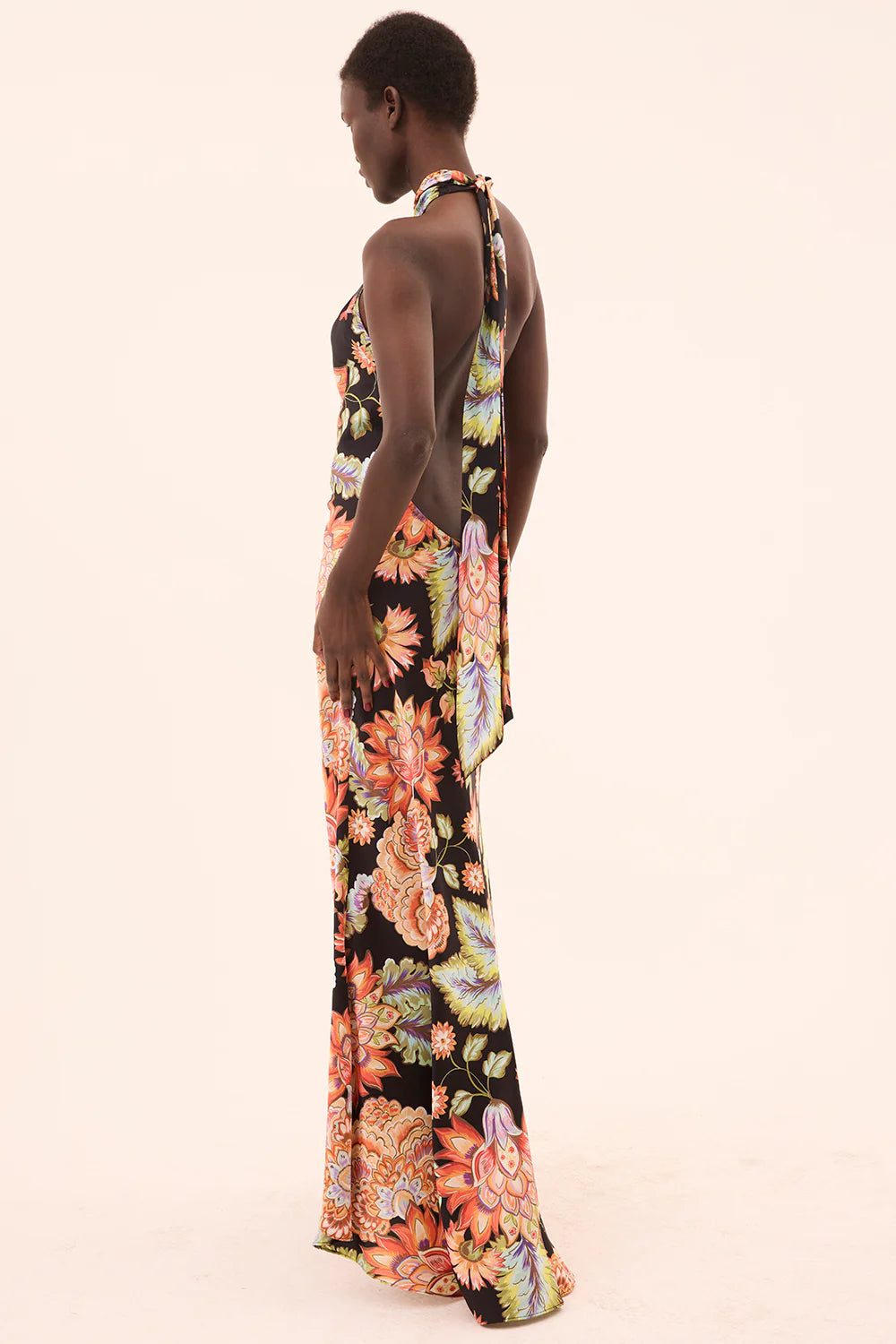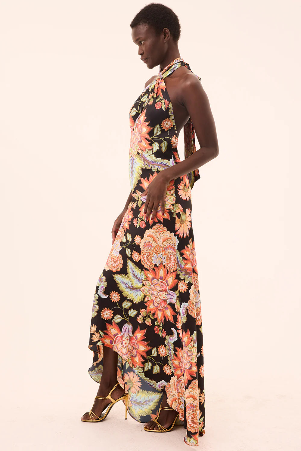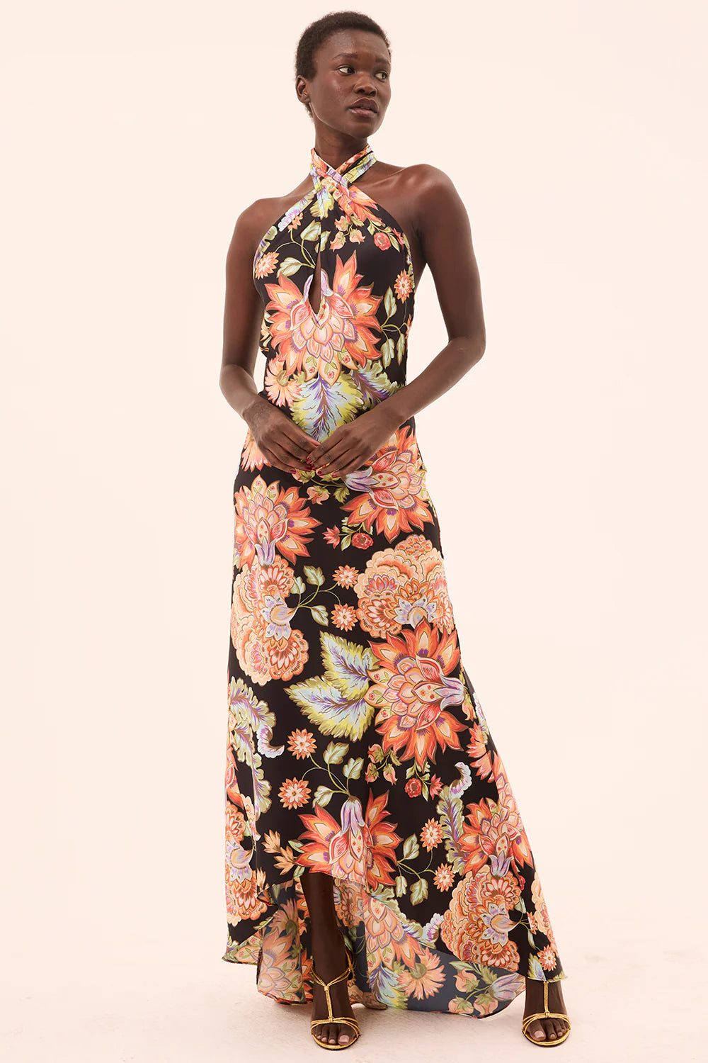 Harley is a stunning, event-ready maxi dress cut from our vibrant Fiery Flora printed satin. This halterneck silhouette features a twist-front bodice with a keyhole detail and a low, open back that ties elegantly at the neck. Finished with a curved, slightly high-low hem for added movement. A dramatic style designed to turn heads this season and beyond.