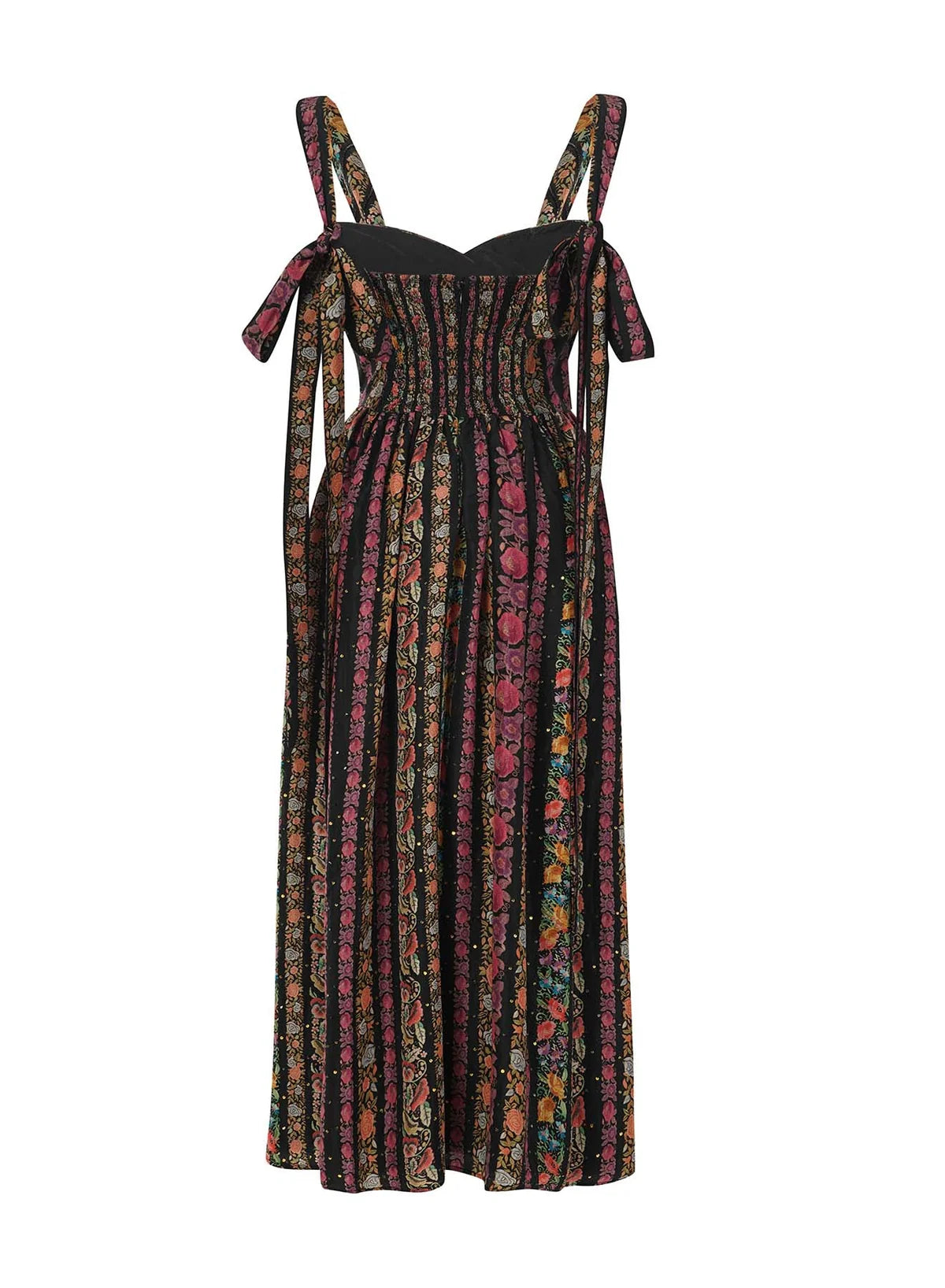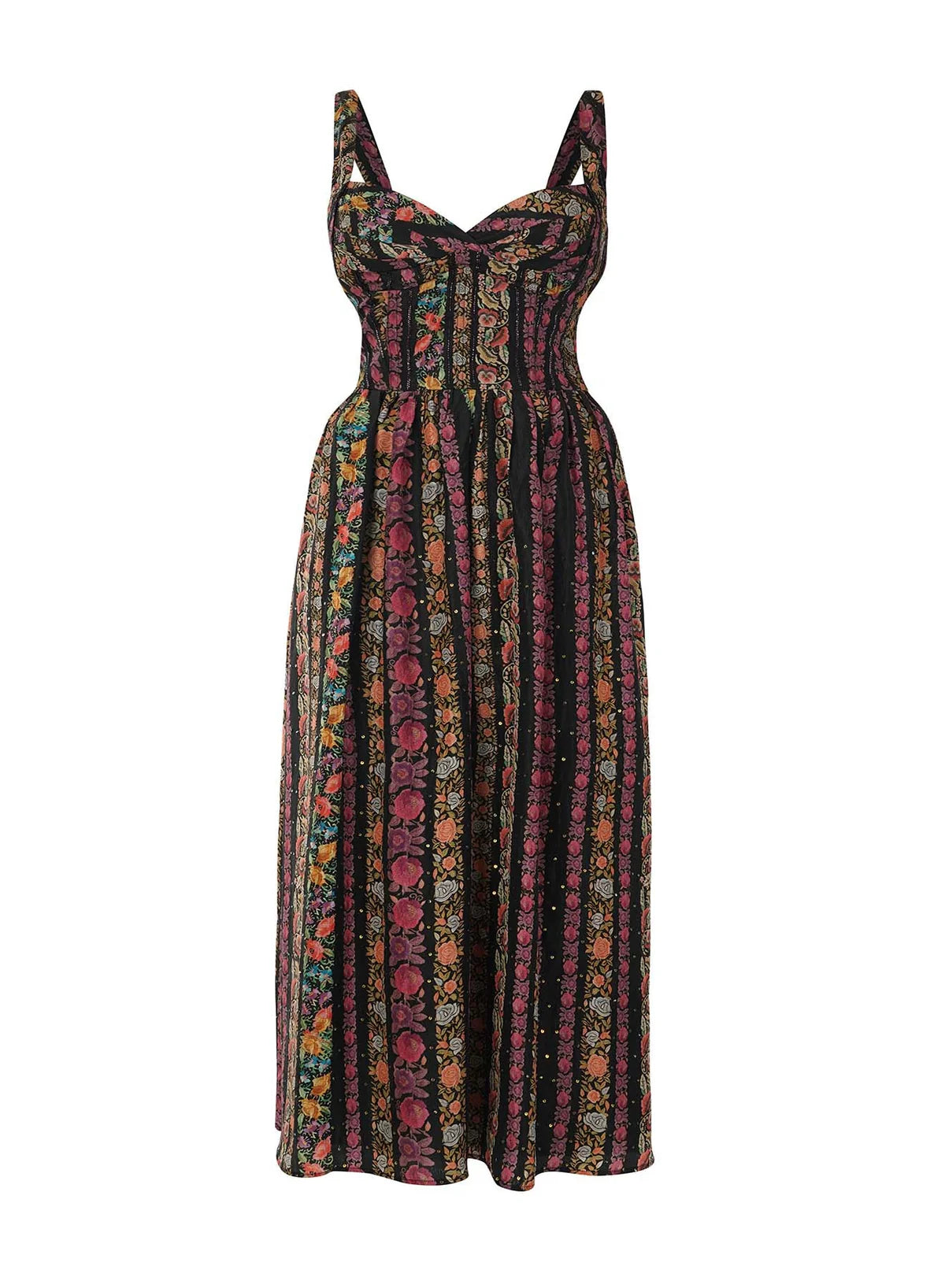 The Kesa Printed Midi Dress showcases a bold allover floral print on luxurious silk habutai, radiating elegance and allure. Its corset-style bodice, adorned with pleated detailing and adjustable tie-up straps, provides a blend of sophistication and customizable comfort. This design delivers a chic and polished silhouette, perfect for any event.