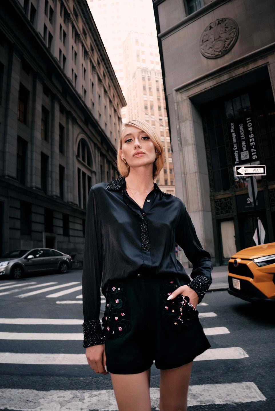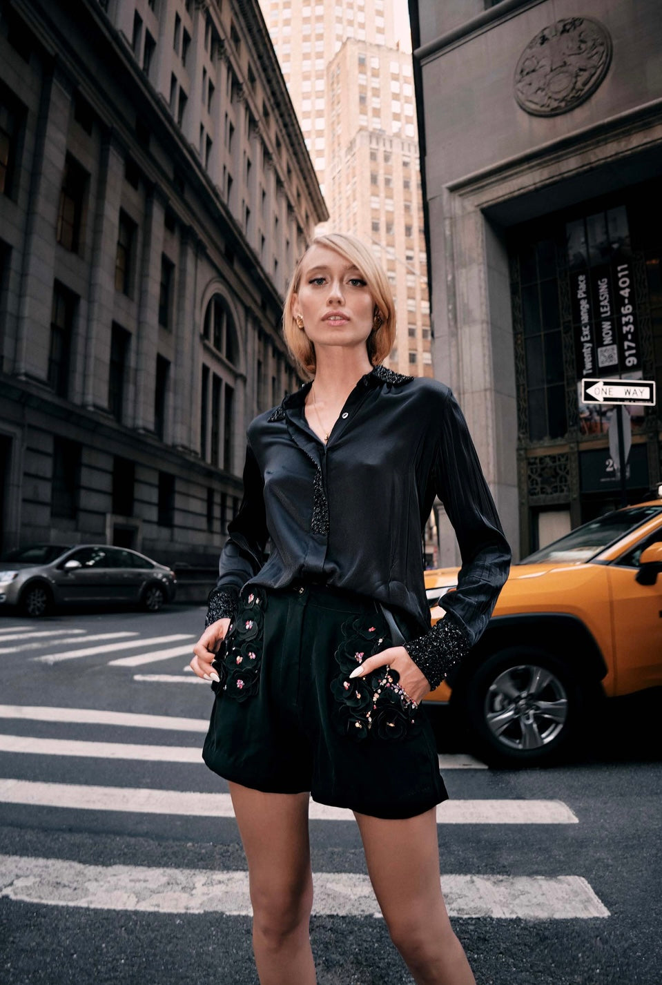 A luxurious and edgy creation that seamlessly combines comfort with high fashion detailing. Crafted from a sumptuous heavy crepe fabric, the shorts feature intricate black on black floral and crystal appliqué along with a tie up belt.