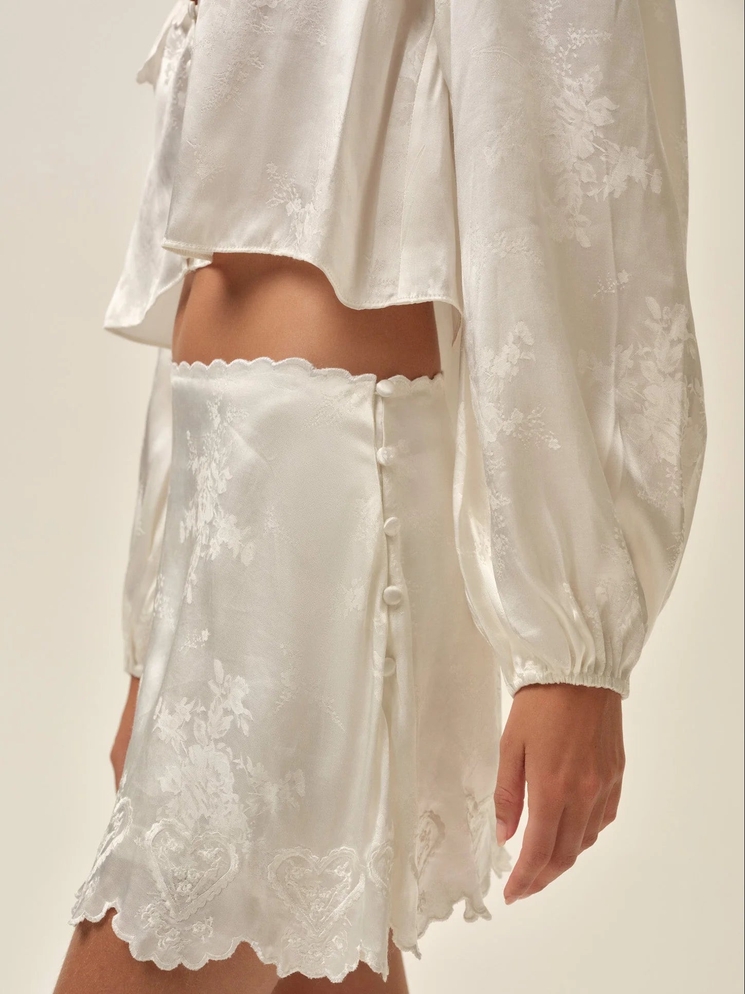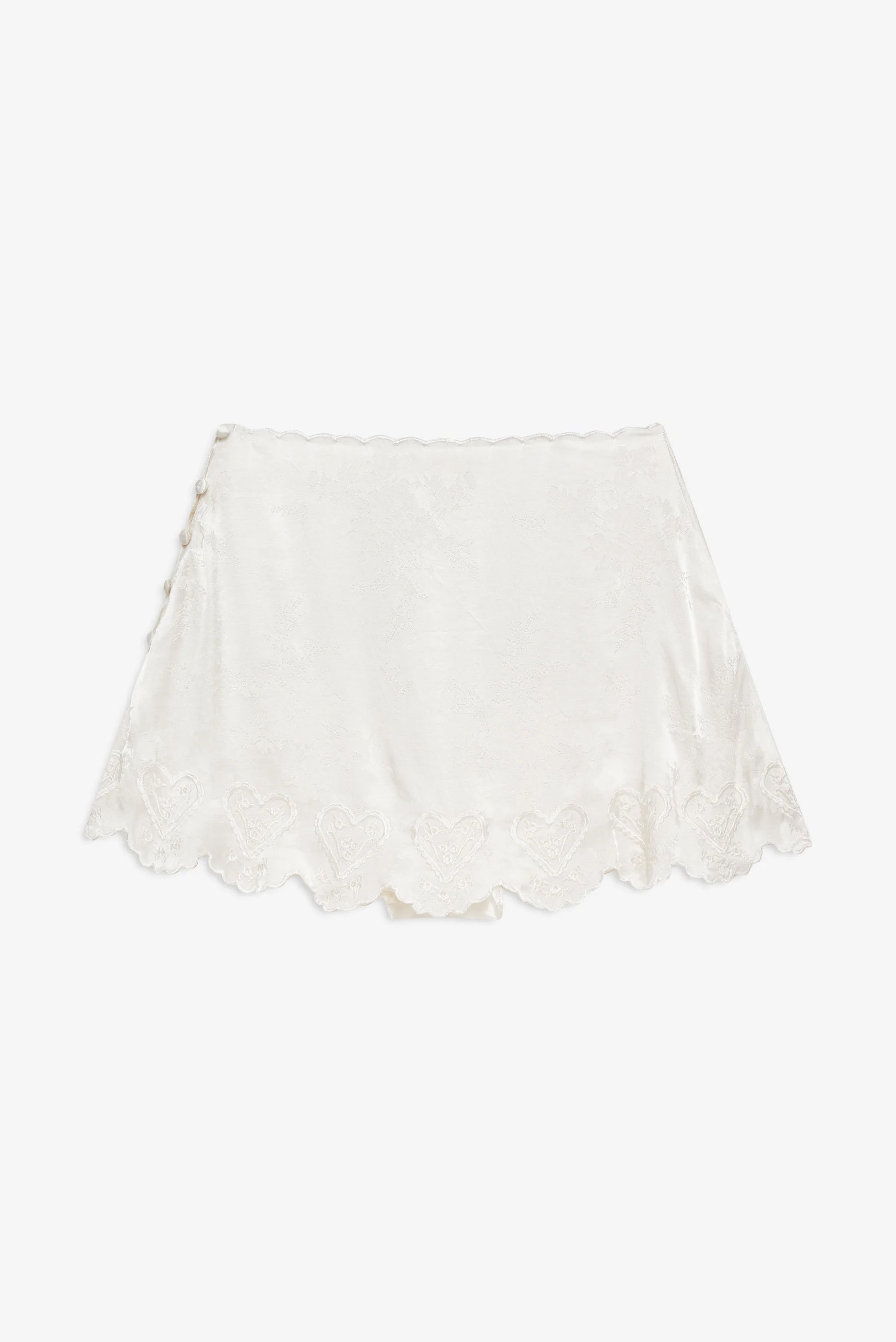 For spring outings that call for something special, the Locked Heart satin skort delivers quiet romance and clever design. An embroidered high-waisted mini skirt drapes over concealed shorts, offering beauty, movement, and ease in equal measure.