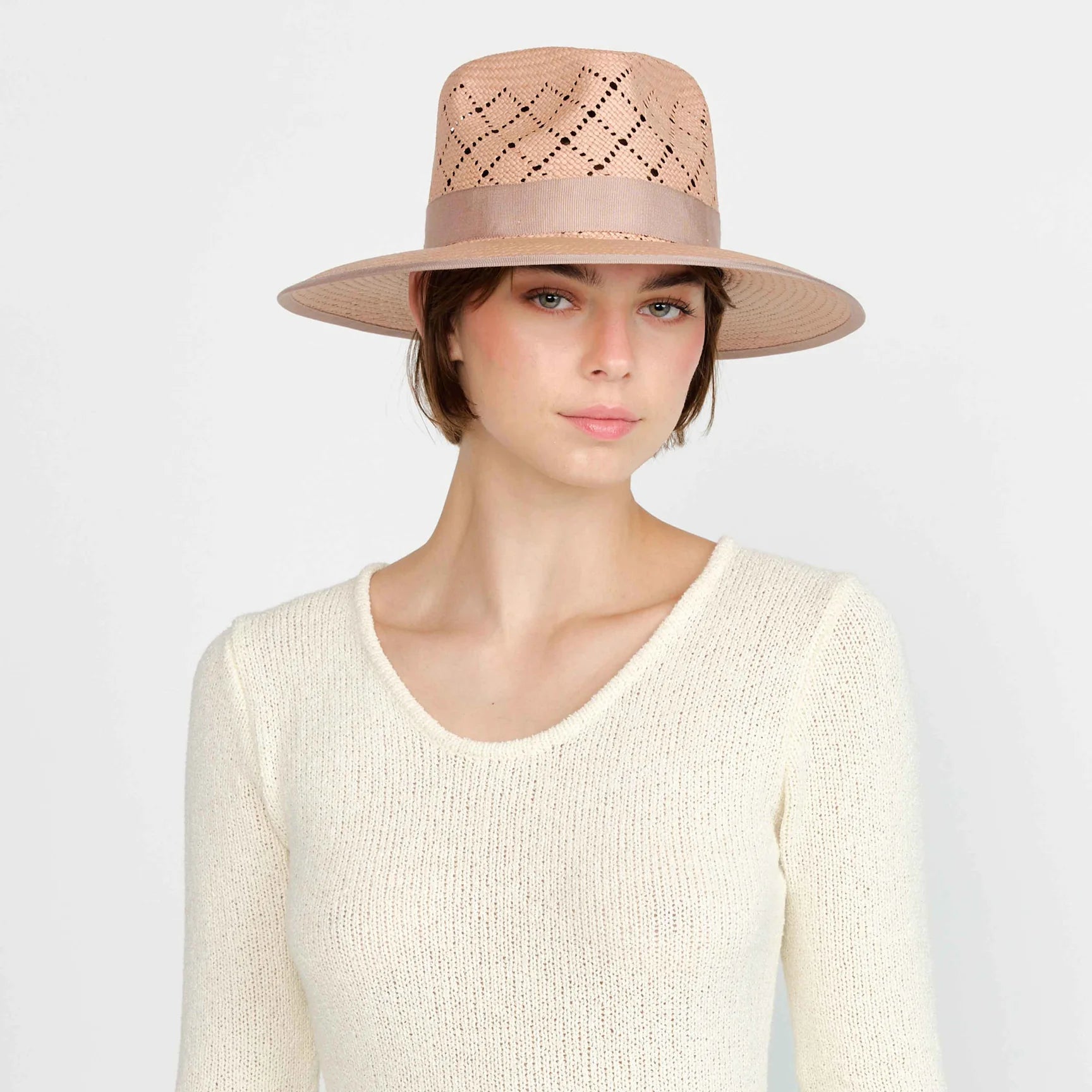- Fedora with intricate vented, diamond-patterned crown and solid woven brim. Brim edge and crown are wrapped in coordinating grosgrain ribbon