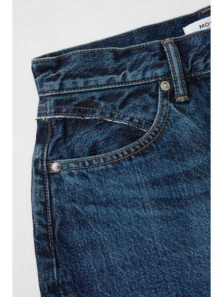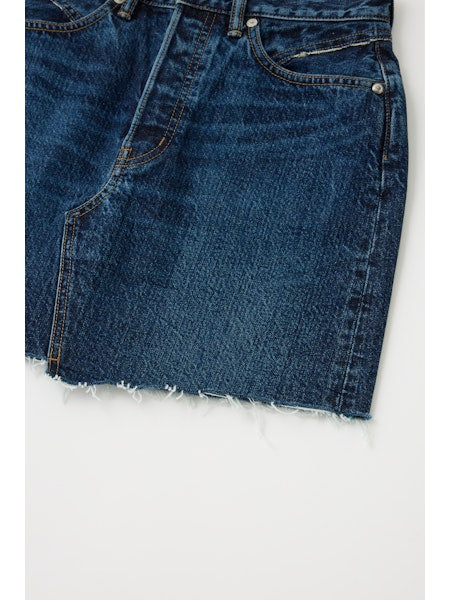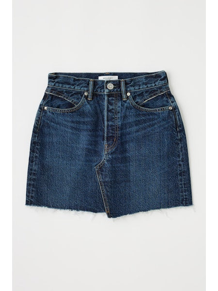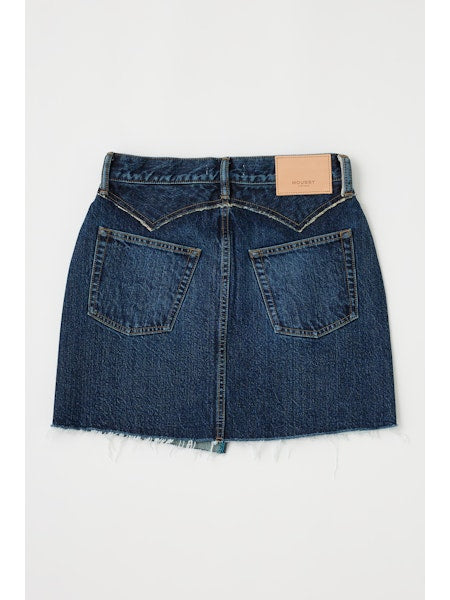 - This denim skirt is a forever classic with a contemporary touch, featuring an asymmetrical button detail, raw hem and a patch pocket on the back.
