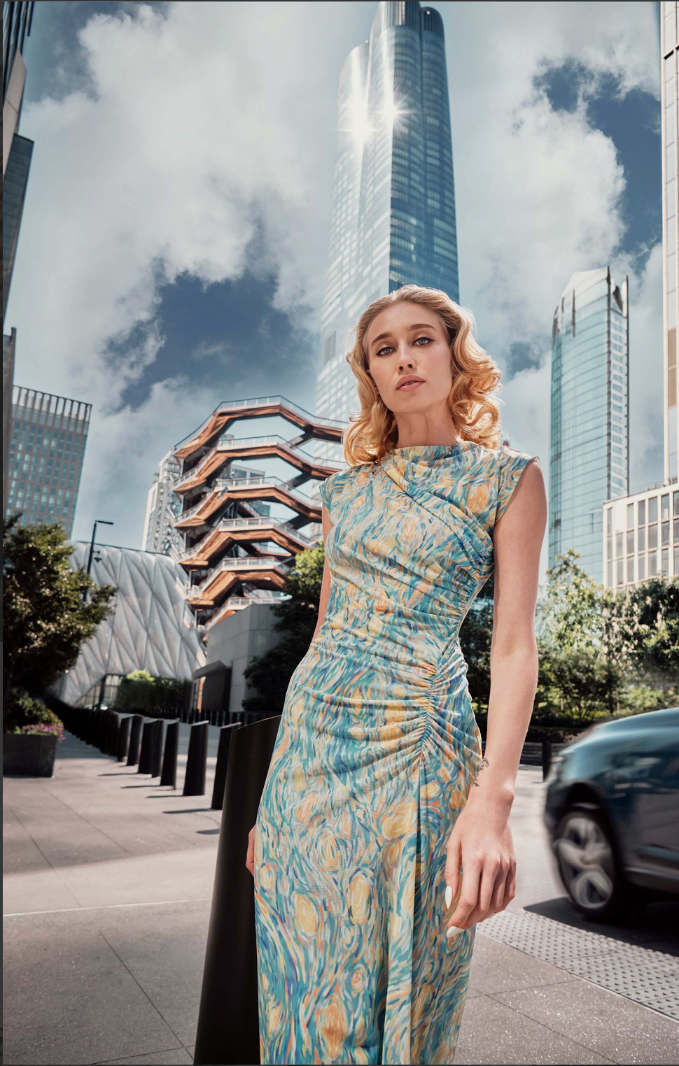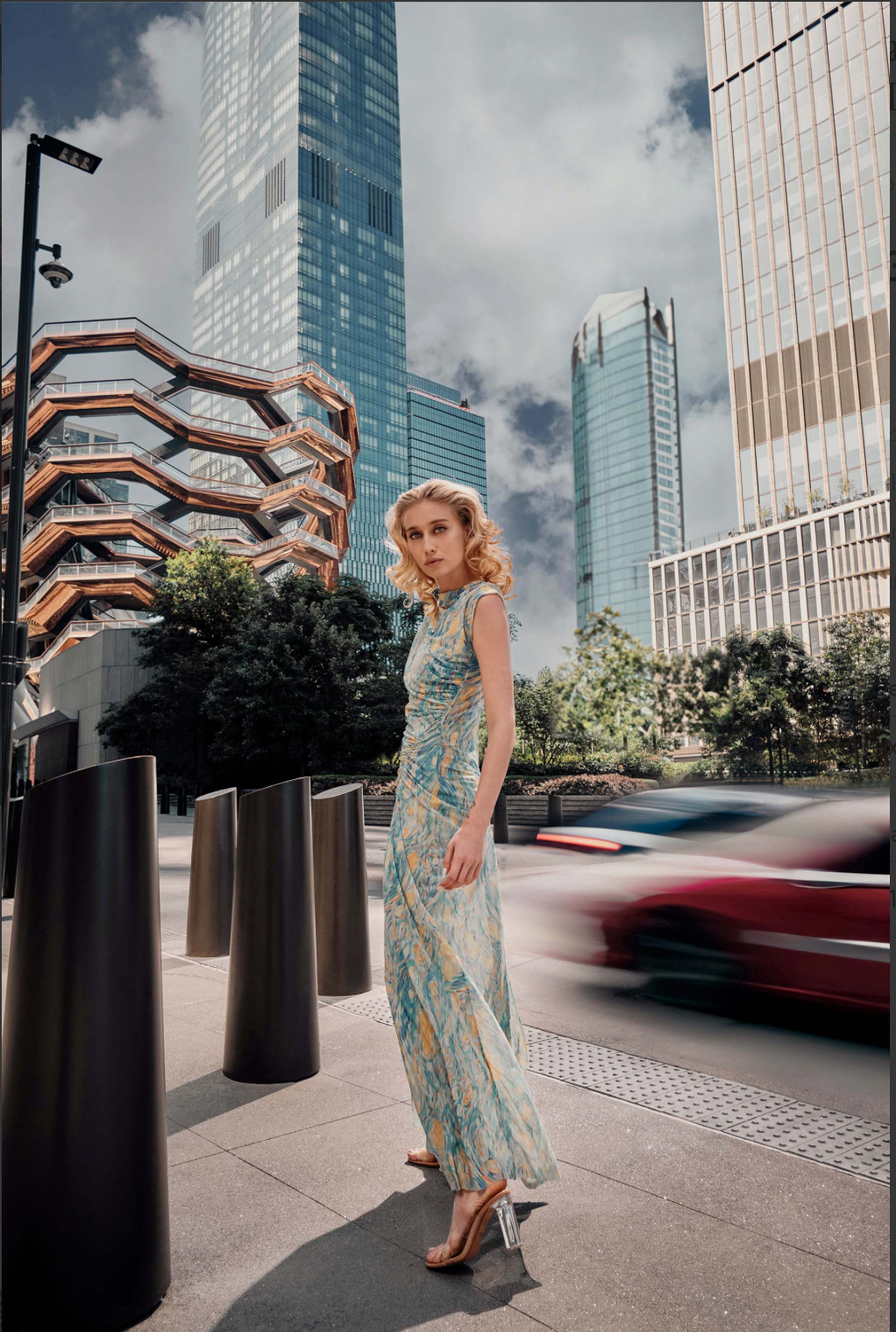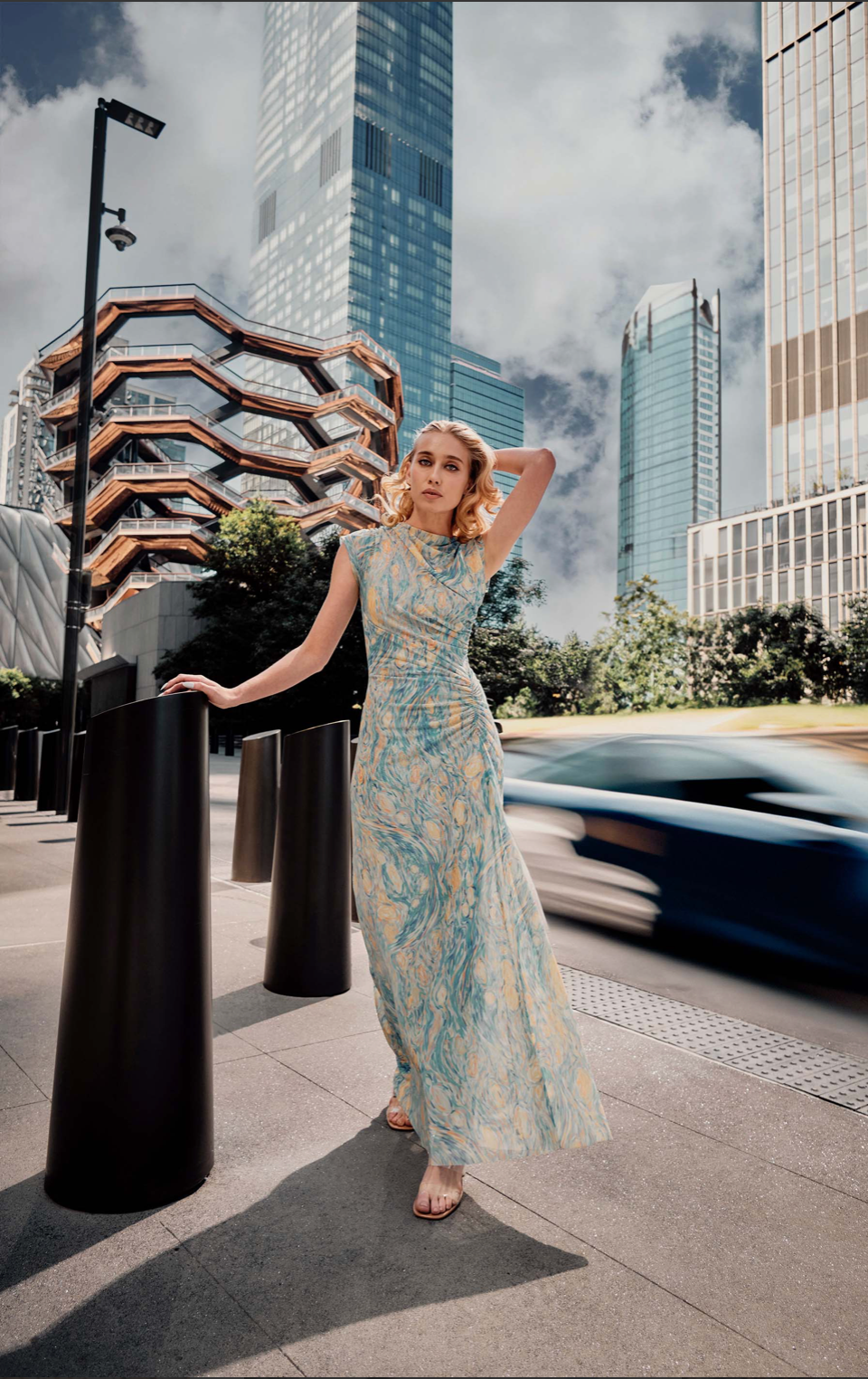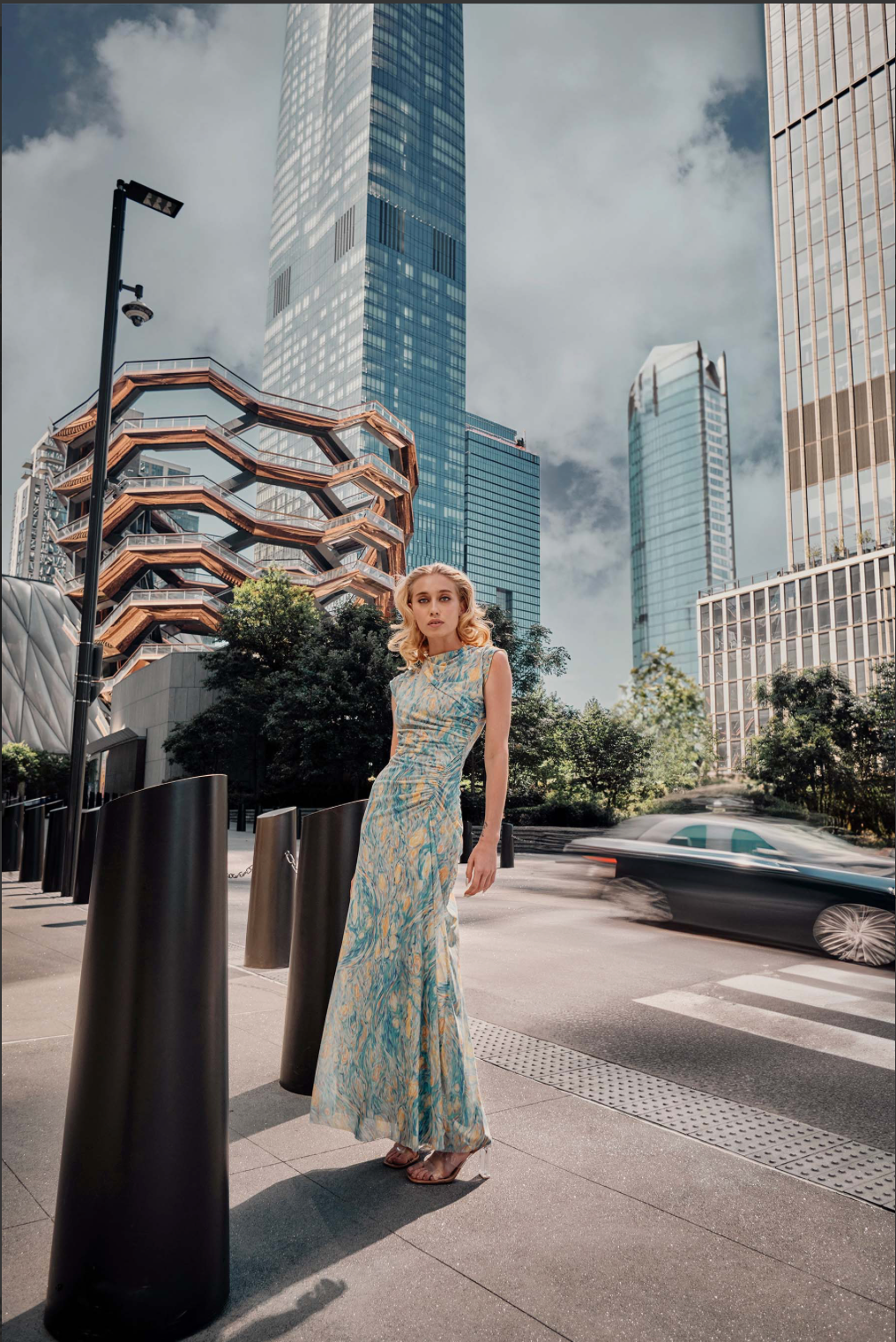 Step into elegance with our fitted maxi dress, featuring a turtle neck and ruching on one side leading to a slit. Crafted from four-way stretch fabric, the overall print is inspired by Van Gogh's " Starry Night", adding celestial charm to your ensemble.