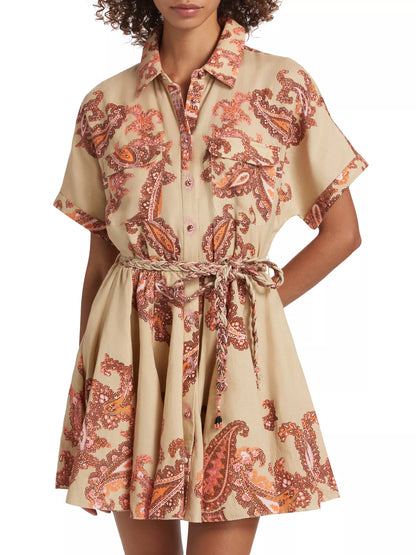 From the Omya Collection. Cut in a fit-and-flare silhouette, Hemant & Nandita's mini shirtdress is crafted of a linen blend. Paisley embroidery and a braided self-tie belt at the waist add charm to this look.