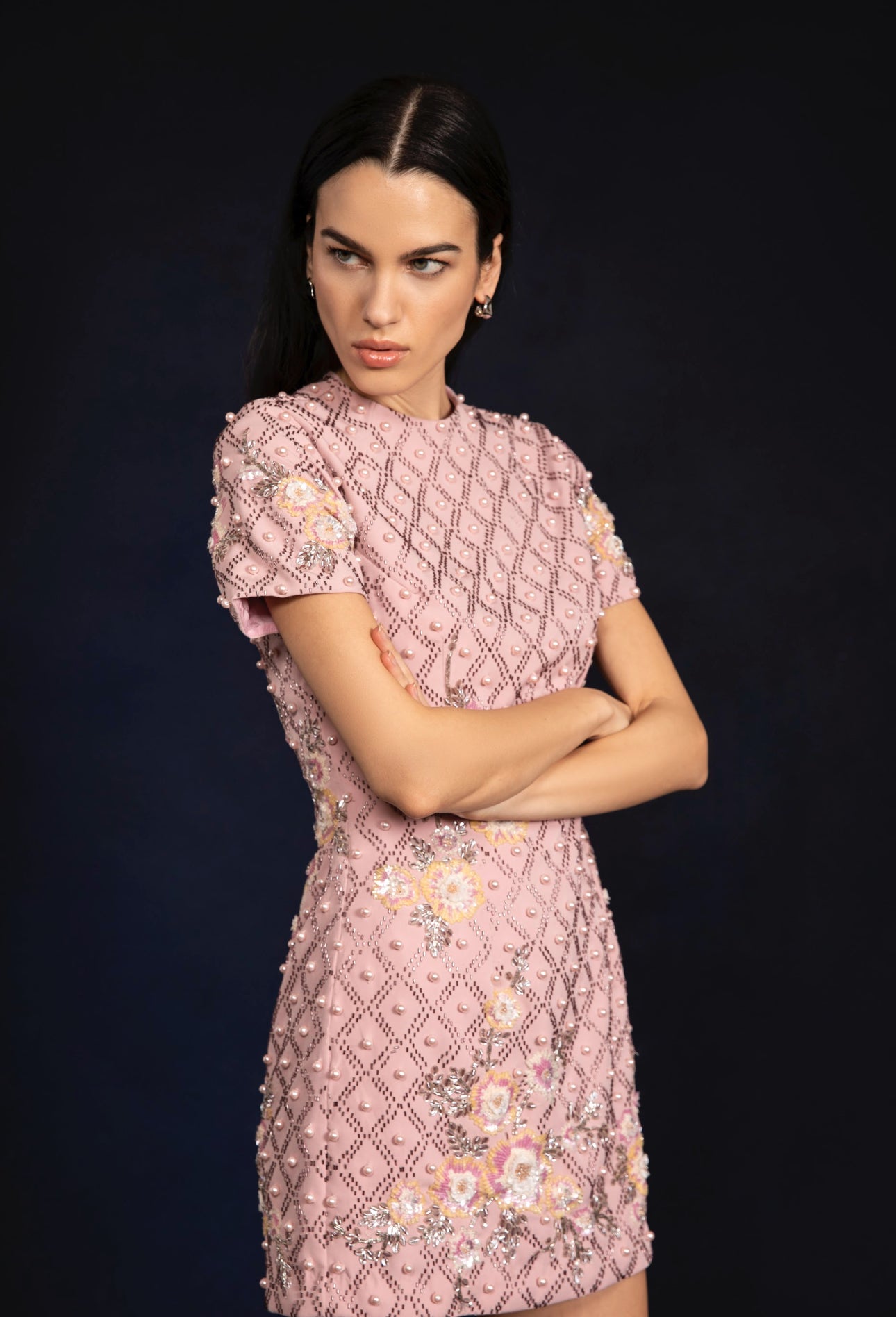 The Paola Dress is a charming piece adorned with exquisite hand embroidered floral designs, showcasing a playful yet sophisticated style.