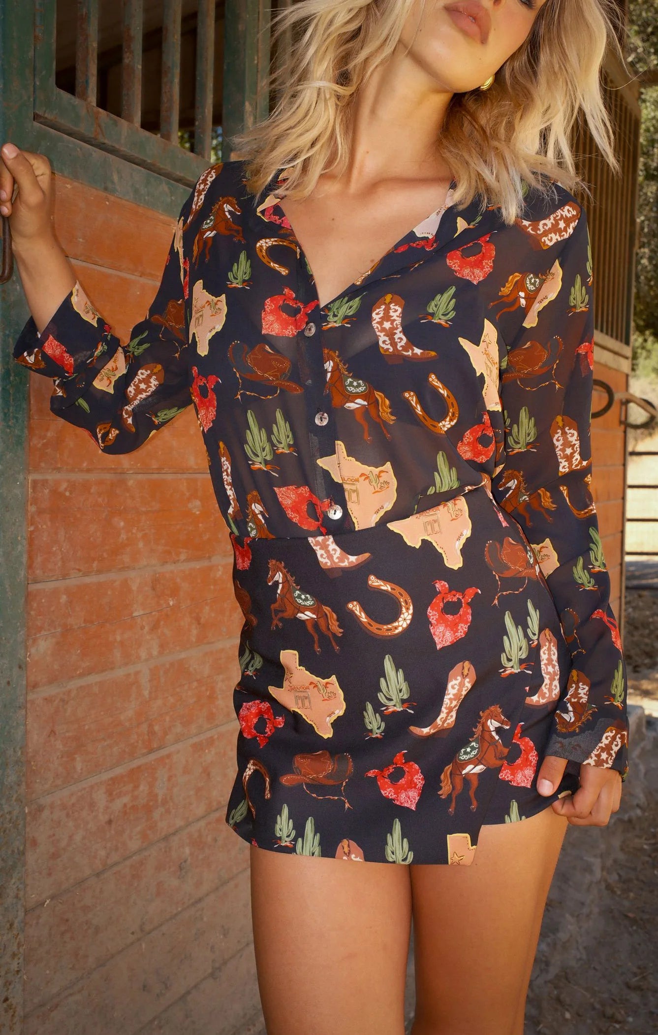 Bring on the Texas charm in this on-trend, high-waisted skort! A bold Texas Hold ’Em print meets an overlapping panel for an edgy, asymmetrical look. Flirty shorts underneath keep it playful and party-ready!